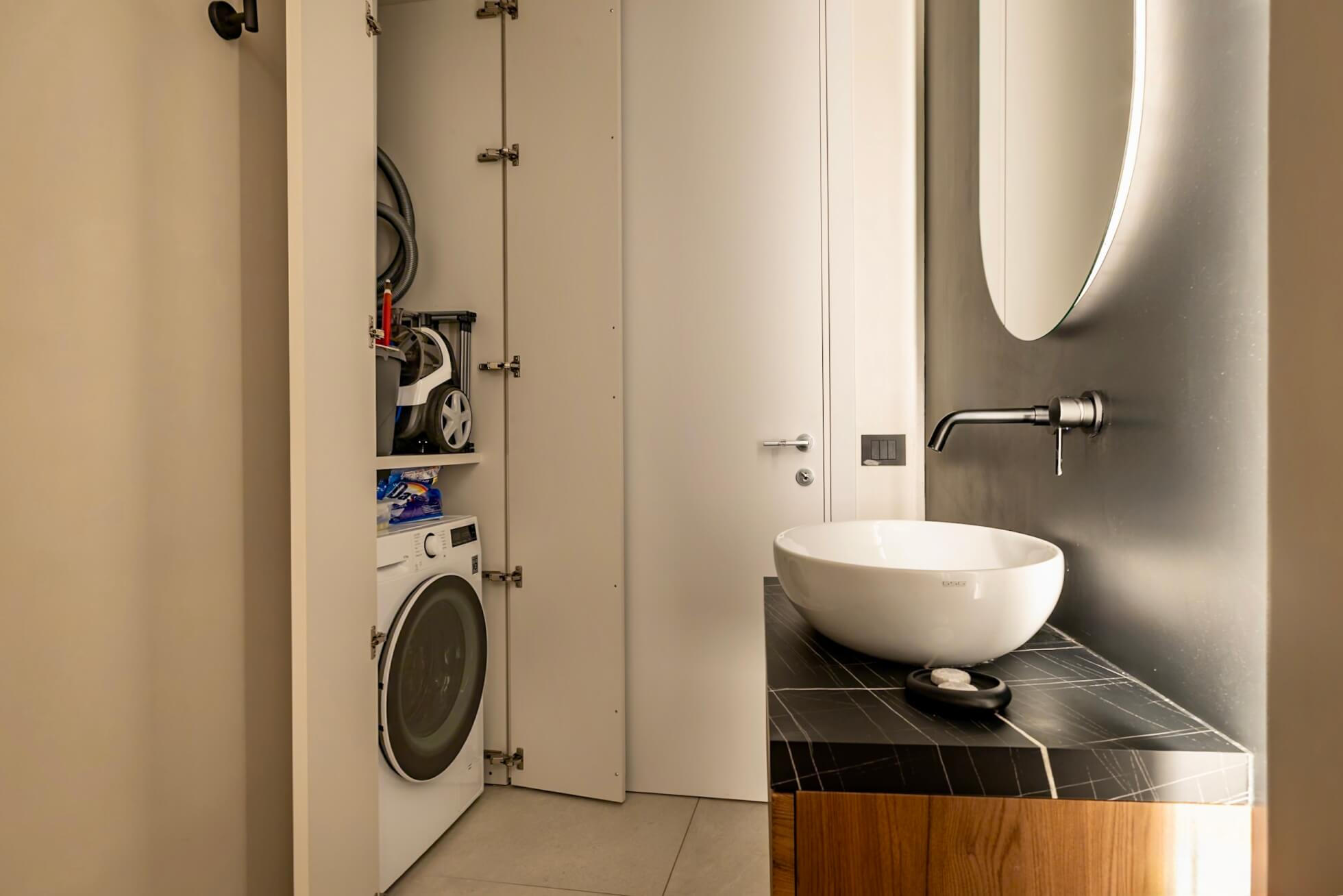 Modern bathroom with walk-in shower, elegant details, and convenient washer for longer stays.